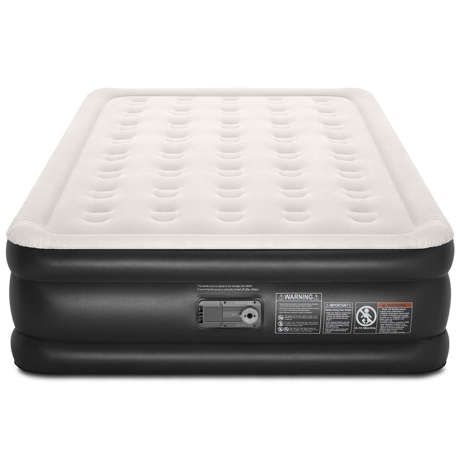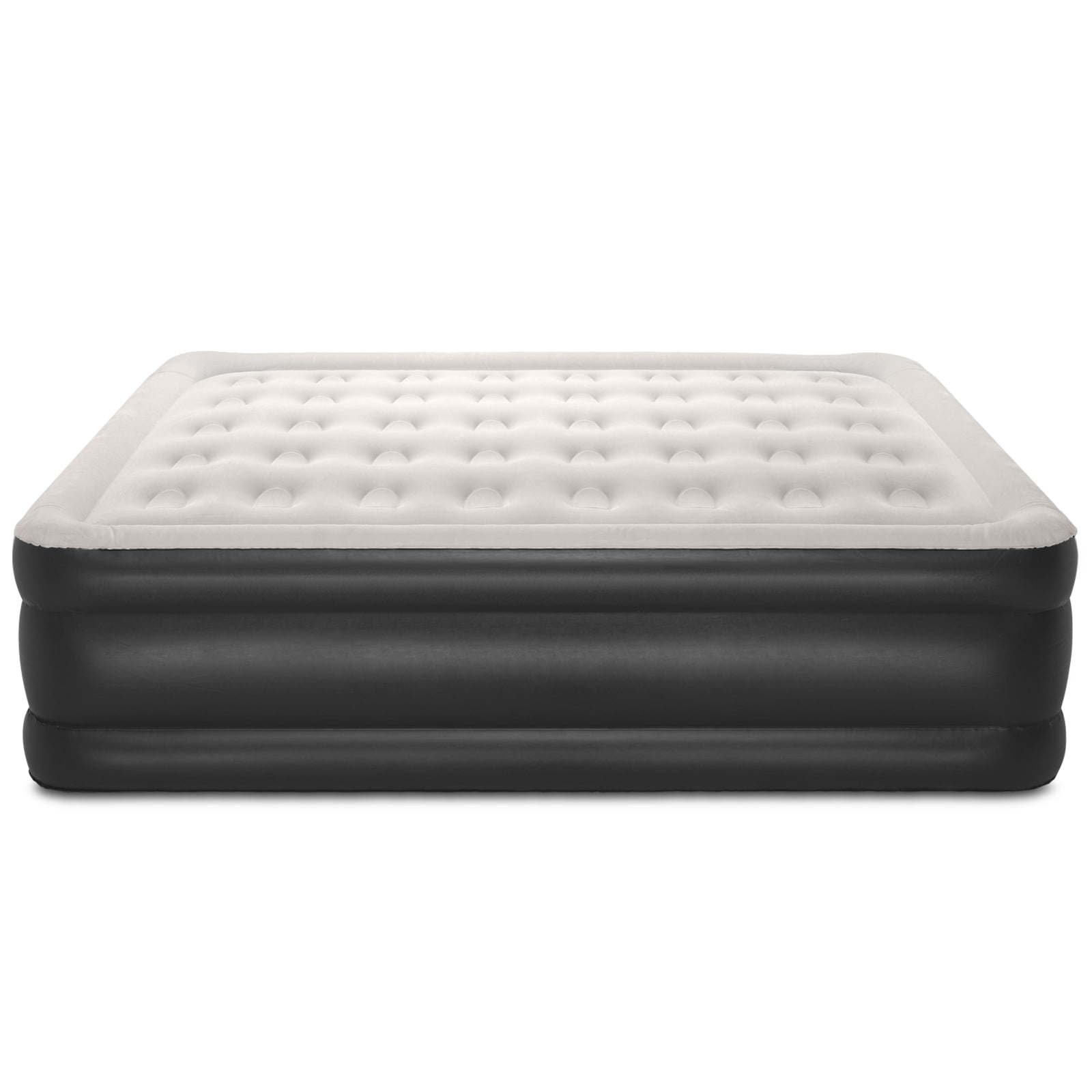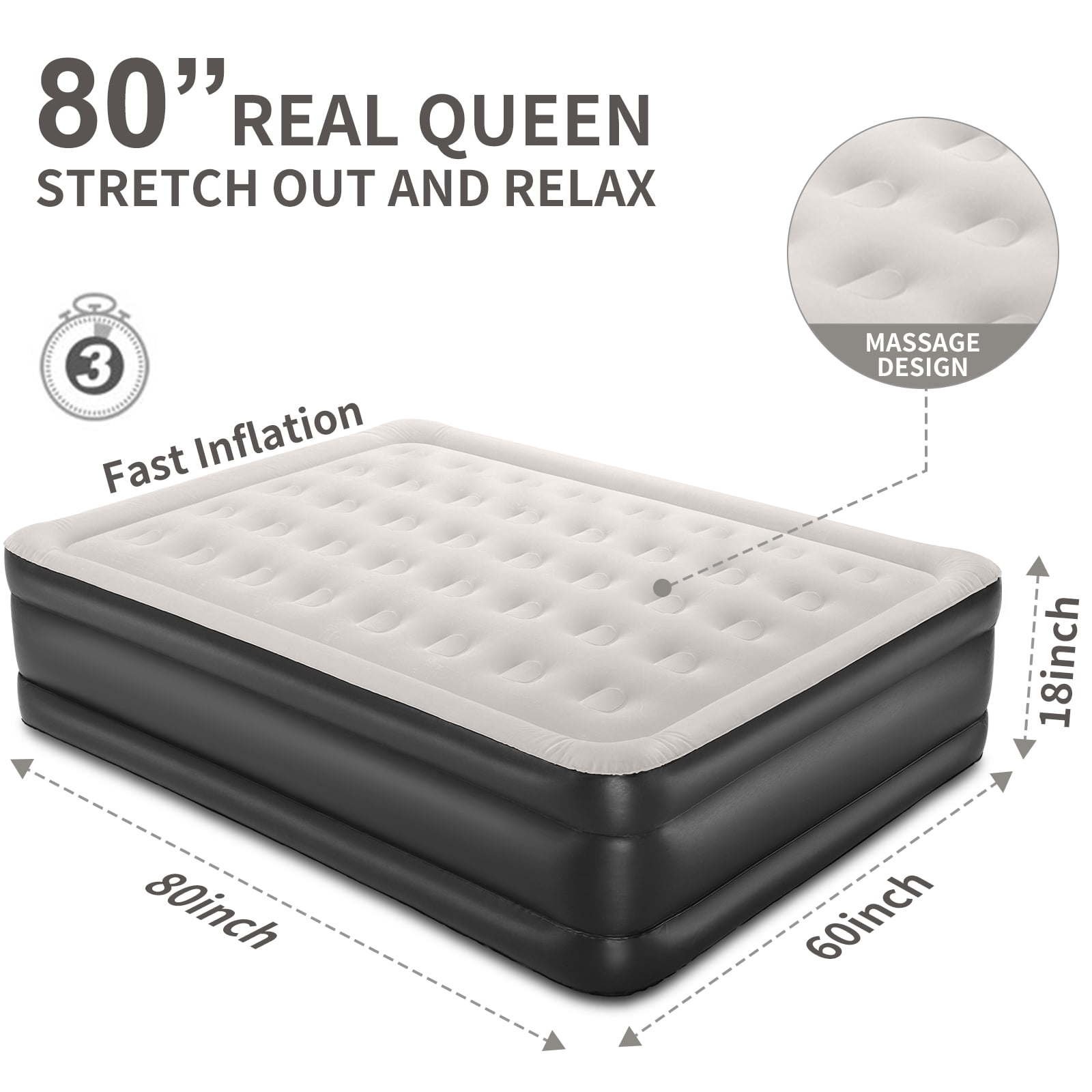 With a lay height of 18 inches when fully inflated; this velvety flocked top queen air mattress is easy to get in and out of; like a really soft plush bed; with or without a sheet. Throw a comforter or sleeping bag over it and you'll find that this is one of the most comfortable air beds you'll ever lie on; thanks to its superior inner coil air beam construction that can support up to 600 lbs. Whether you're using it indoors as an extra blow-up bed for overnight guests; on a road trip across America in a truck; or taking it on a weekend tent camping trip outdoors; an inflatable bed with a built-in pump will get you After many years of amazing sleeping experience. Inflatable air mattress for weekend guests and family visiting.18" Queen Air Mattress with Built-in Air Pump; Black and Blue